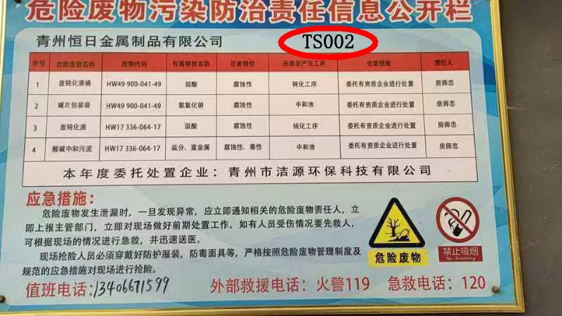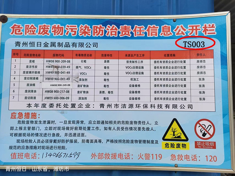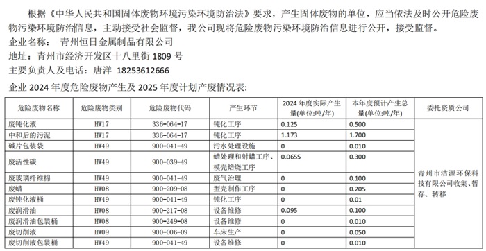2026年青州恒日金属制品有限公司危险废物污染环境防治信 息公示
